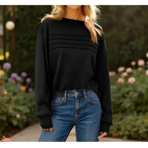 Klasika se snoubí s modernou. Top volného střihu se vyznačuje čistým kulatým výstřihem s jemnými plisovanými detaily, které dodávají střih bez kompromisů v pohodlí. Ideální pro vrstvení nebo samostatné nošení.